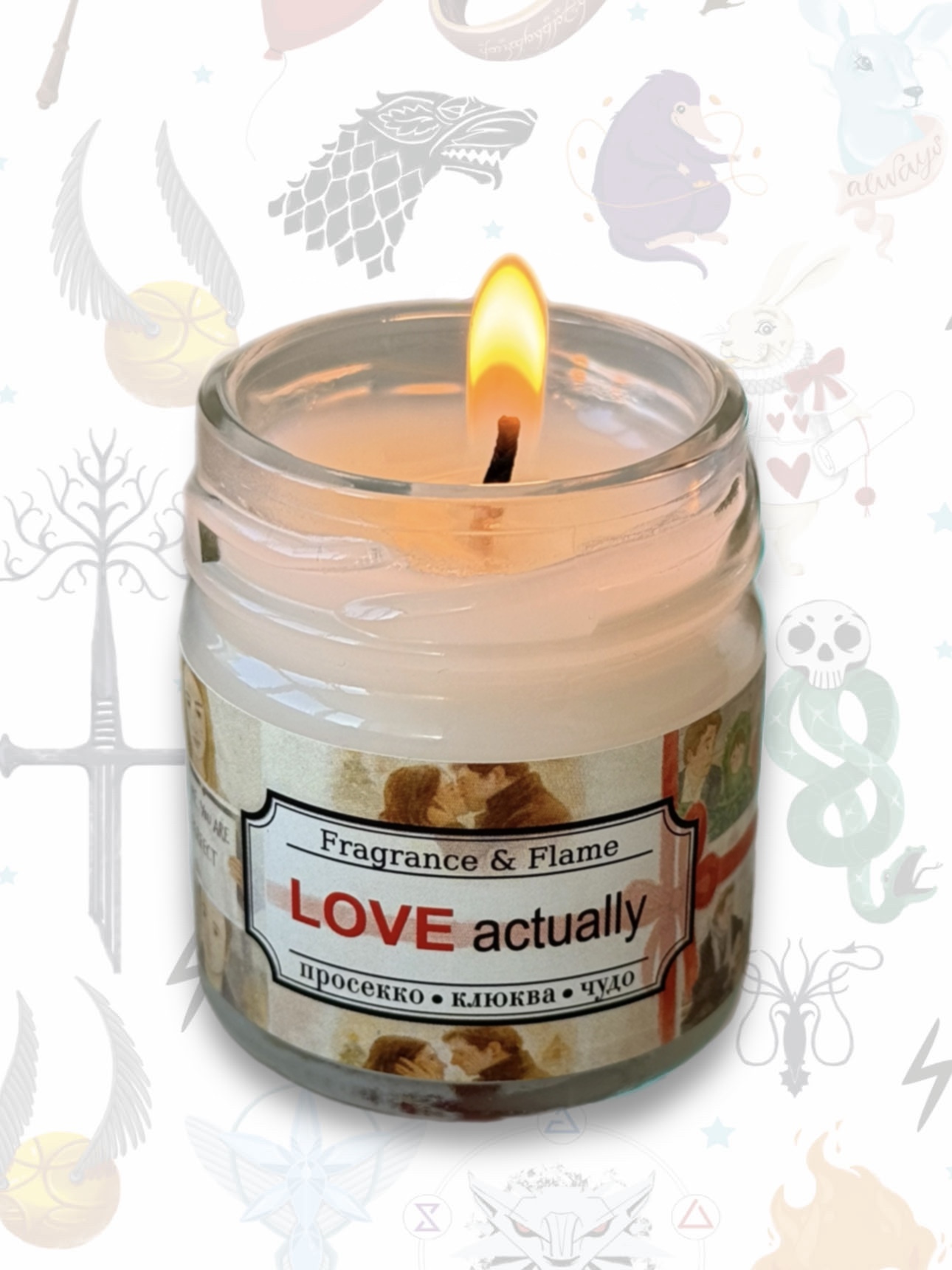 Ароматическая свеча Fragrance & Flame «Реальная любовь» — это маленькая вселенная тепла, киношной магии и предвкушения праздника. Она создана по мотивам легендарного фильма, где любовь появляется там, где её меньше всего ждёшь, и превращает обычные моменты в самые важные.